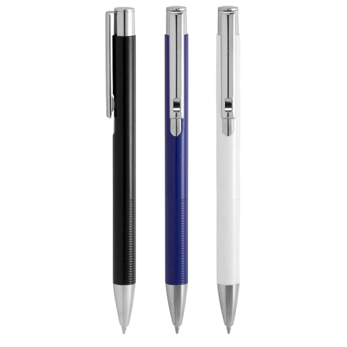 Bolígrafo retráctil. Cuerpo de aluminio en diferentes colores acabado mate. Botón, clip y puntera metálicos cromados.  Tinta Azul.