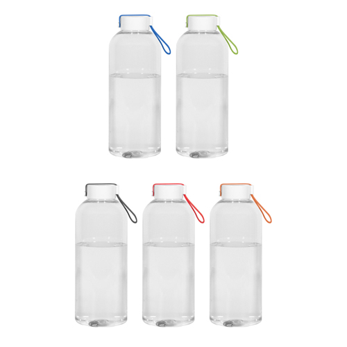 Botella de plástico transparente con tapa a rosca plástica. Blanca. Lazo de silicona en diferentes colores. Libre de BPA.