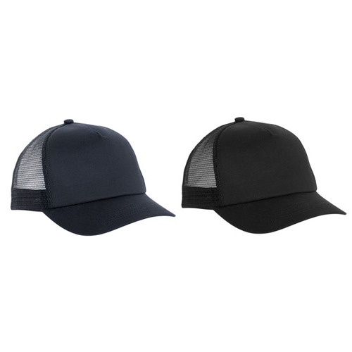Jockey Trucker 5 paneles. Panel frontal y visera de algodón. Paneles posteriores de malla poliéster del mismo color. Botón forrado. Banda absorbente de poliéster. Cierre con broche plástico ajustable de doble cremallera del mismo color.