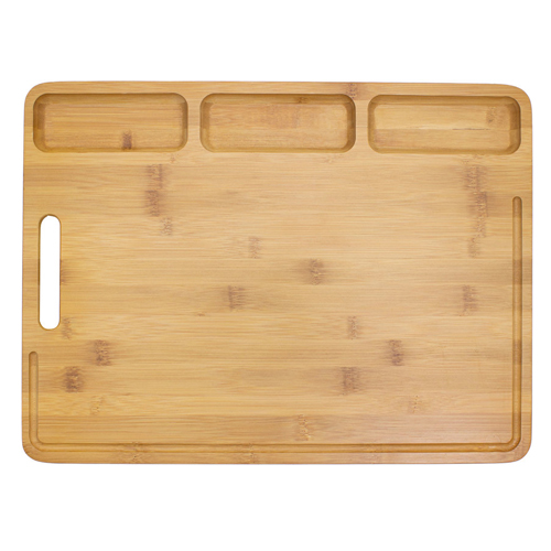 Tabla de Coctail en Bambú. Tres compartimentos para armar botanas y llevarlas directo a la mesa. Transportable con manija incluida. Presentación en caja de regalo.